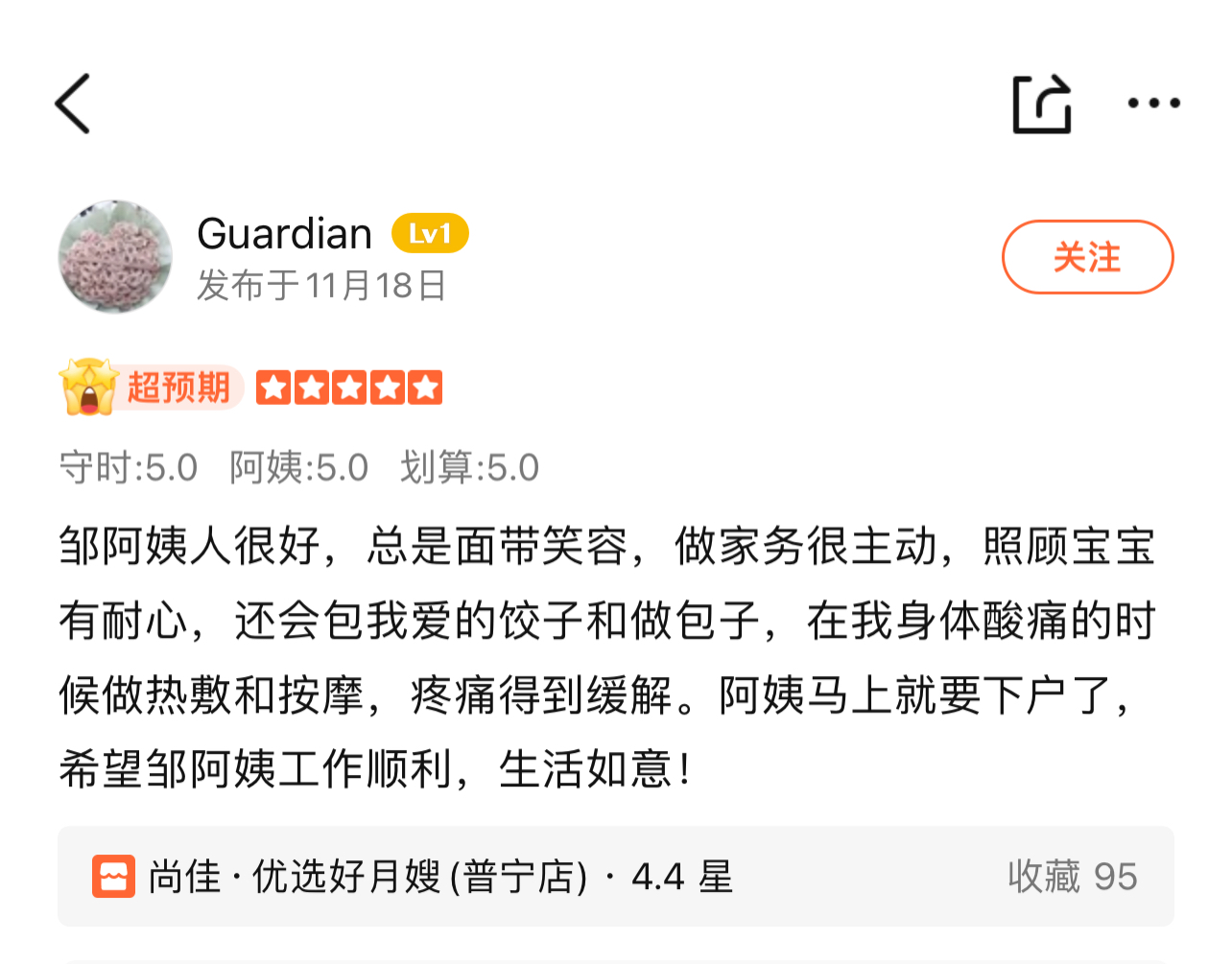 英姐雖然是江西瑞金人,家在潮汕都十出年了,等于半個汕頭人,英姐性格好,護理專業(yè)科學,細心到位,和客戶相處融洽,月子餐美味,對寶寶護理很用心,細心;日常護理做得很到位,及時發(fā)現(xiàn)寶寶的身體癥狀并告知寶媽。英姐做的月子餐也很好吃,每天的菜色不帶重復的,也能及時調整寶媽的口味,非常棒!為人也很開朗,勤快,客戶的家人都贊不絕口! 極力推薦!